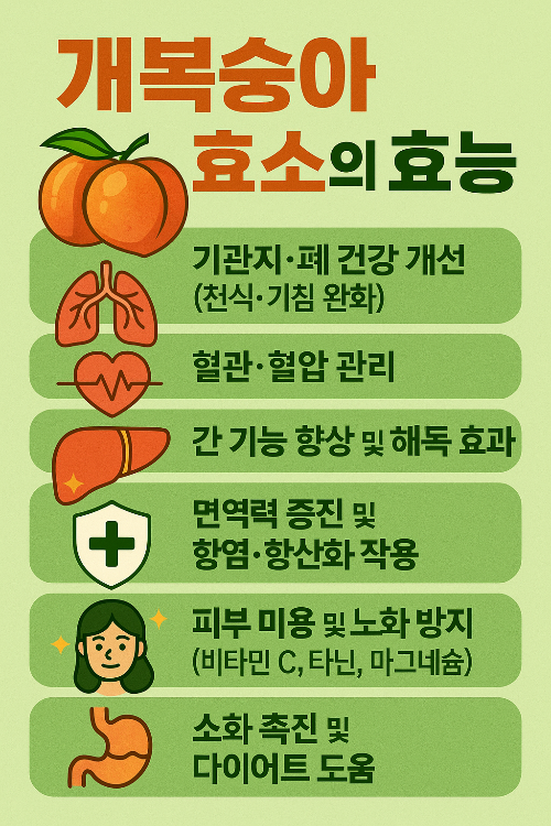 개복숭아에는 ‘아미그달린’이라는 성분이 있어요. 이게 또 비타민 B17이라고도 부르는데요, 이름만 들어도 묘하게 건강해지는 느낌이죠? 아미그달린은 씨앗이나 과육에 들어있고, 오래전부터 기침·천식·기관지염 같은 호흡기 질환에 좋다고 알려져 있어요