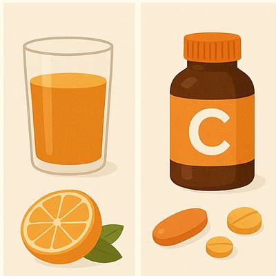비타민 C는 과일과 채소를 통해 먹는 게 가장 좋아요! 오렌지, 딸기, 키위, 브로콜리, 피망 같은 것들 말이죠 . 아무래도 자연식품에는 비타민 C뿐만 아니라 섬유질, 항산화물질, 미네랄도 함께 들어 있어서 훨씬 더 건강하답니다 .