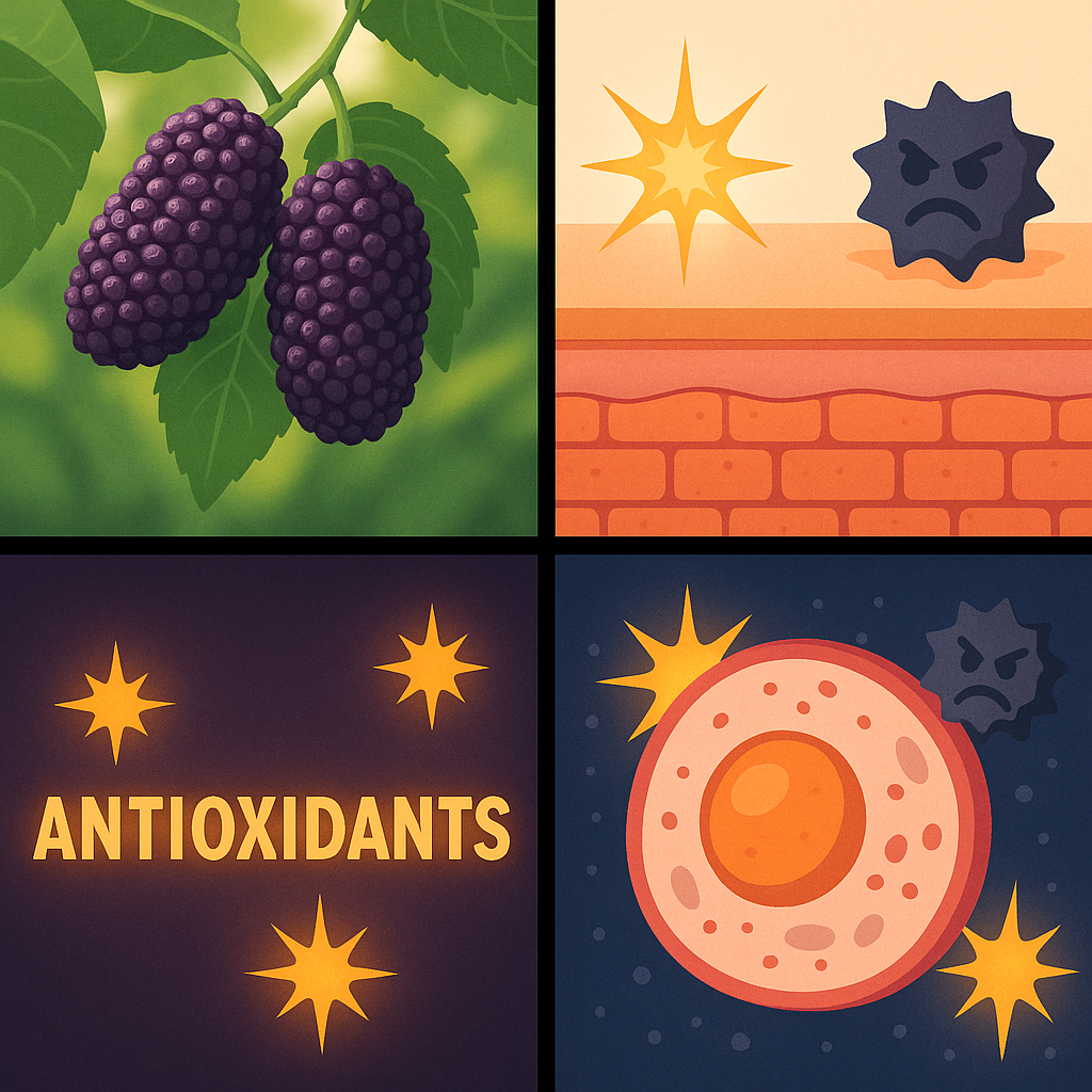 활성산소는 DNA, 단백질, 세포막 등을 공격해 세포를 망가뜨리는 역할을 하는데요. 오디 속 항산화 성분들이 이런 활성산소를 잡아줘서 세포 손상을 예방하고, DNA 돌연변이 발생도 줄일 수 있어요.