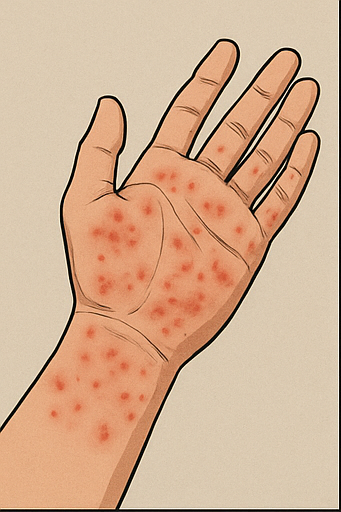 가장 흔한 증상은 두드러기처럼 올라오는 발진이에요. 따끔따끔 간지럽고, 심하면 물집도 생겨요. 얼굴이며 팔이며 붉게 부어오르는 경우도 있어서, 이건 진짜 장난이 아닙니다.