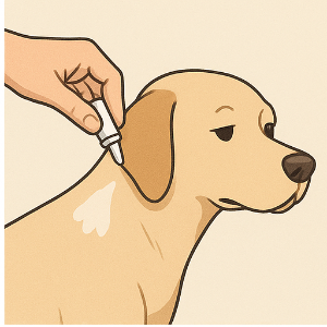 다음은 바르는 약, 즉 외용약이에요. 보통 강아지의 목덜미 피부에 액체 형태로 톡! 떨어뜨리는 방식이에요. 이 약은 피부를 통해 흡수돼서 몸속에 퍼지고, 심장사상충 유충이 침입했을 때 방어해주는 역할을 해요.