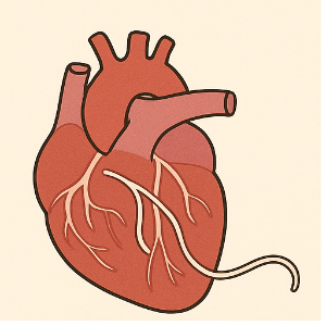 즉, 모기 → 개 또는 고양이 순서로 감염이 되는 거죠. 이 유충은 혈관을 타고 몸속 깊이 들어가서 심장 쪽으로 이동해요. 그리고 몇 개월이 지나면 성충으로 자라나서 심장이나 폐혈관에서 슬슬 문제를 일으키기 시작하죠.