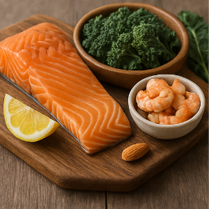 • 생선과 해산물: 연어 같은 기름진 생선은 단백질과 오메가‑3 지방산이 풍부해서 인슐린 민감성을 도와 혈당 조절에 좋아요 .