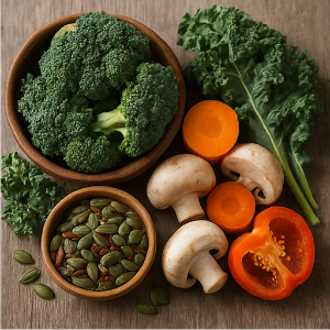 • 잎채소와 야채: 시금치, 케일 같은 잎채소와 브로콜리, 당근, 버섯, 피망 등은 혈당을 빨리 올리지 않고, 포만감도 주는 착한 친구들이에요 .