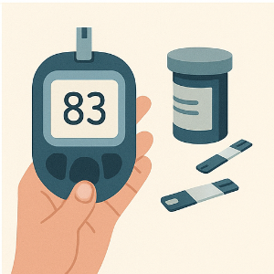 혈당 측정기는 작고 귀여운 작은 기계예요. 보통 검사지(테스트 스트립)를 먼저 삽입하고, 옆구리에 작은 바늘(랜싯)을 이용해 손가락 옆 부분을 살짝 찌르면 혈액 한 방울이 나와요. 그 혈액을 검사지 끝에 살짝 닿도록 하면, 기계가 순식간에 혈당 수치를 보여줍니다 .
