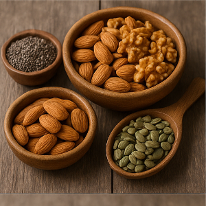 - 견과류와 씨앗류: 아몬드, 호두, 치아씨, 호박씨 등은 건강한 지방과 단백질이 많아서 식후 혈당이 급하게 오르는 것을 막아줘요 .