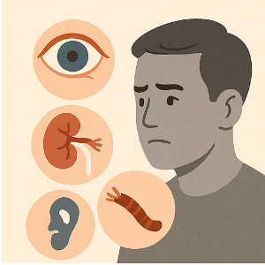 혈당이 지나치게 높아지면 곧바로 나타나는 증상뿐 아니라, 시간이 지나면서 무서운 건강 문제들을 유발할 수 있어요. 초기 증상으로는 너무 목이 마르고, 화장실을 자주 가고, 피곤하거나 시야가 흐려지는 등 불편함이 나타날 수 있어요. 이런 불편을 무시하면 눈, 신장, 신경, 심장 등 우리 몸 구석구석이 상처를 입기 시작해요 .
