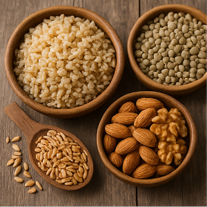 - 통곡물과 콩류: 현미, 귀리, 보리 같은 통곡물과 렌틸콩, 병아리콩 같은 콩류는 섬유질과 단백질이 풍부해서 소화를 천천히 도와 혈당이 천천히 오르도록 해요 .