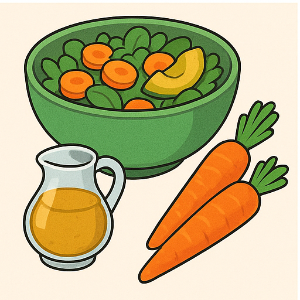 샐러드에 당근을 채 썰어 넣고, 드레싱이나 아보카도, 견과류, 올리브유 같은 건강한 지방과 함께 먹으면 베타카로틴 흡수에 도움돼요.