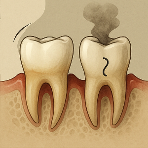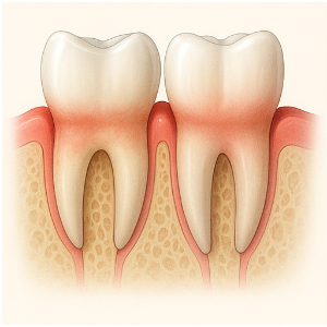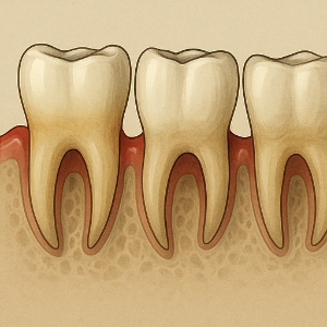 염증이 잇몸을 넘어 치조골까지 퍼지면 뼈가 천천히 녹기 시작해요. 이때 치아와 잇몸 사이에 주머니 같은 공간(치주낭)이 생기고, 치아가 흔들리기 시작해요 .