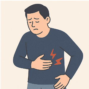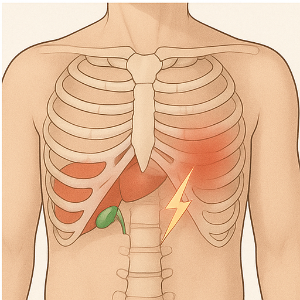 • 담낭(쓸개) 질환—담석이나 담낭염은 오른쪽 갈비뼈 아래에서 심하고 쑤시거나 욱신한 통증을 유발할 수 있고, 특히 기름진 음식 섭취 후에 더 심해질 수 있어요 .