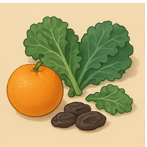 비타민 K는 뼈를 만드는 과정에서 칼슘이 몸 밖으로 빠져나가지 않게 도와요. 케일이나 자두 같은 음식에 많이 들어 있답니다.