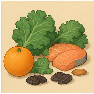 - 칼슘은 뼈의 주요 성분이에요. 유제품, 채소(케일·브로콜리 등), 견과류, 콩류에 많이 들어 있죠.