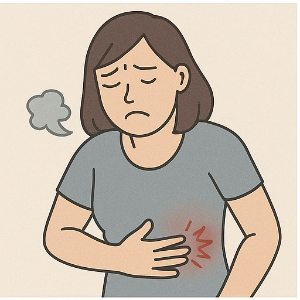 - 담낭(쓸개)에 문제가 생기면, 숨을 깊이 들이쉴 때 통증이 급격히 심해지고, 미열이나 오심, 구토가 동반될 수 있어요. ‘머피 징후’라는 특징적인 반응이 나타날 수 있습니다.