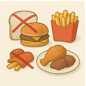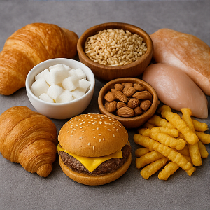 지나치게 기름지고 칼로리 높은 음식은 체중 증가와 함께 인슐린 저항성을 높일 수 있어요. 예를 들면 튀김류나 정크푸드, 고지방 가공육(핫도그, 소시지 등)이 해당돼요.