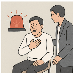 가슴 통증과 함께 식은땀이 나거나, 어지럽고, 심할 경우 실신할 것 같은 느낌이 든다면, 이는 ‘몸이 위급 상황이다!’ 라고 외치는 경고음이죠. 이런 증상이 동시에 나타난다면 즉시 응급실을 찾아야 해요.