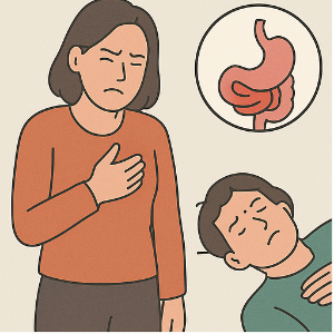 • 위식도 역류: 식사 후 위산이 올라오면서 가슴 중앙이 쓰리거나 타는 듯한 느낌. 누워 있거나 몸을 굽히면 더 심해지고, 제산제로 완화되기도 해요 .