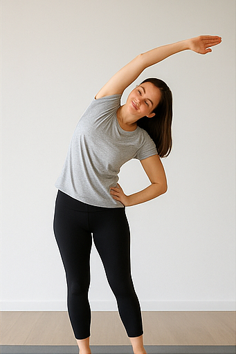 - 손을 머리 위로 든 상태를 유지하면서, 상체를 한쪽 방향으로 천천히 옆으로 기울여 보세요.