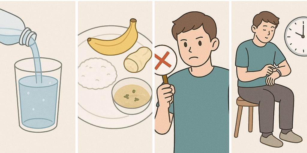 이럴 때는 물이나 이온음료를 조금씩 자주 마셔 수분과 전해질을 보충하는 것이 중요합니다. 단, 커피나 탄산음료, 술은 오히려 탈수를 악화시킬 수 있으니 피해야 합니다.
