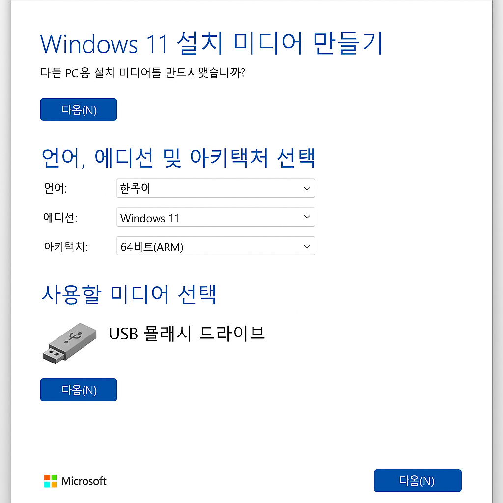 클린 설치하거나 부팅 USB를 만들 때 사용하는 도구입니다. 초보자도 쉽게 사용할 수 있어 가장 많이 선택되는 방식이에요.