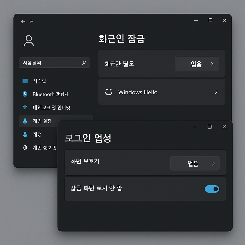 하지만 아래 두 단계를 거치면 실제 사용 체감은 거의 “암호 없음”에 가깝게 만들 수 있습니다.