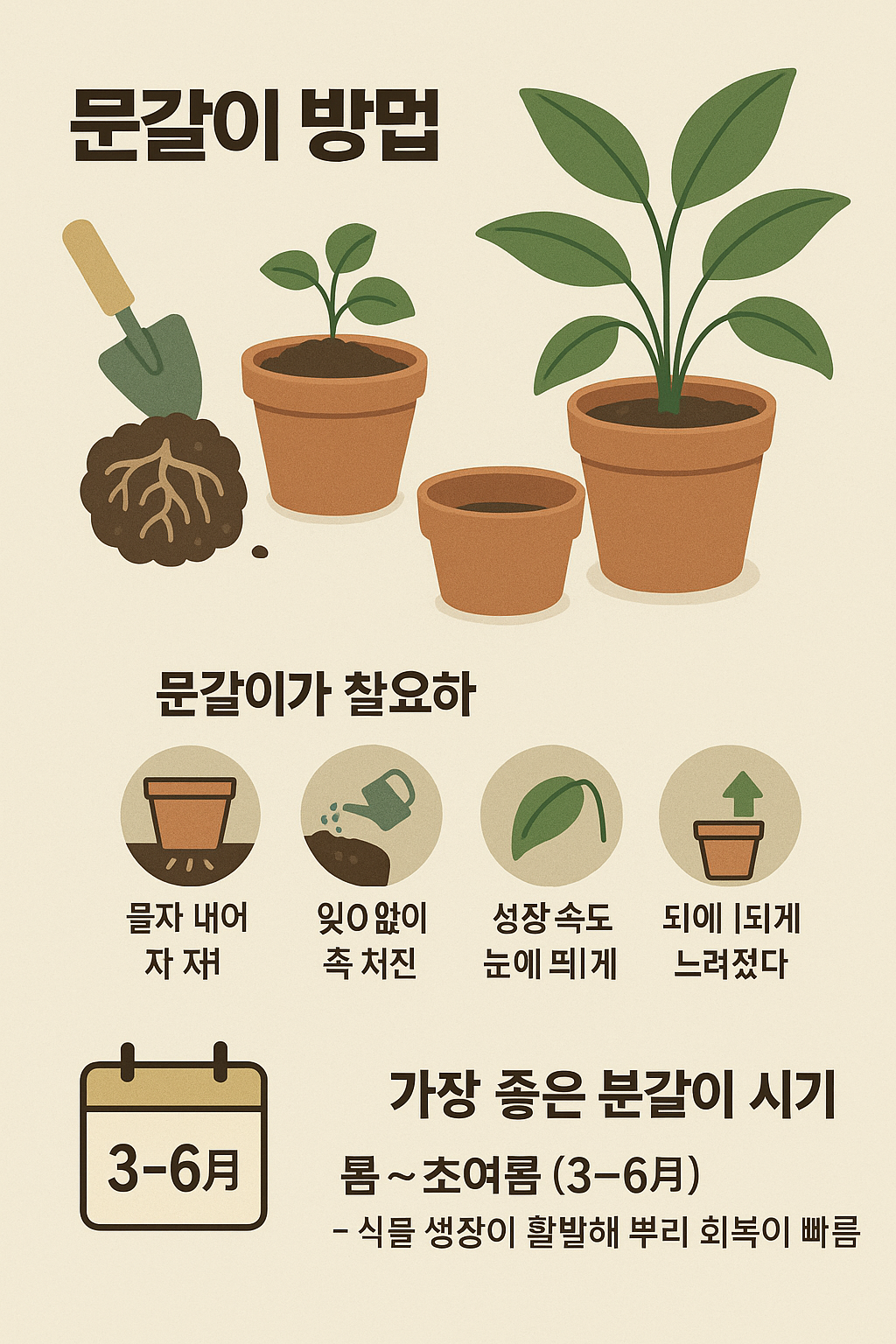 → 식물 생장이 활발해 뿌리 회복이 빠름 - 한여름 폭염기, 겨울철 휴면기에는 가급적 피하는 것이 좋습니다.