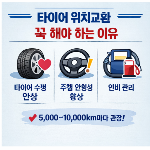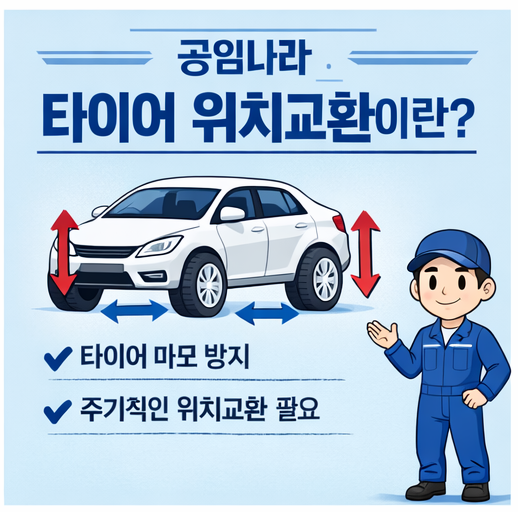 타이어 위치교환(타이어 로테이션)은 앞바퀴와 뒷바퀴의 위치를 바꿔 장착하는 정비 작업입니다.