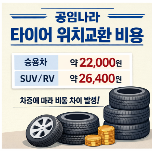 공임나라는 타이어 1개 기준 공임으로 비용이 책정되며, 차량 종류에 따라 차이가 있습니다.