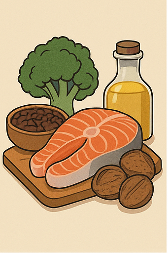 섬유질이 풍부한 식품은 콜레스테롤을 몸 밖으로 내보내는 데 도움을 줘요. 특히 귀리, 보리, 현미 같은 곡물류는 속 편하고 든든해서 꾸준히 먹기 좋아요. - 오메가3 풍부한 식품 챙기기