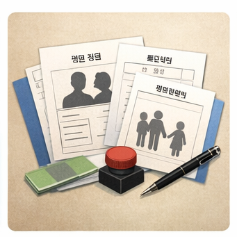 협의이혼 절차에서 가장 많이 막히는 부분이 서류 준비입니다. 기본적으로 협의이혼의사확인신청서, 혼인관계증명서, 가족관계증명서, 주민등록등본이 필요합니다. 미성년 자녀가 있다면 양육 및 친권자 결정에 관한 협의서도 제출해야 합니다. 서류는 최근 발급본을 권장하며, 인적 사항 오기재가 없도록 주의해야 합니다. 신청서는 부부가 함께 작성하고 서명해야 하며, 대리 신청은 제한적입니다.