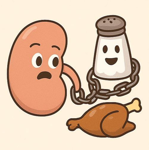 소금 많이 먹으면 혈압이 오르죠? 고혈압은 신장을 망가뜨리는 대표적인 원인이에요. 특히 라면, 햄, 치킨무처럼 짭짤한 음식에는 나트륨이 듬뿍 들어 있어서 조심해야 해요.