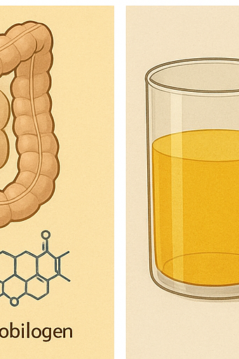이 효소 덕분에 빌리루빈이 ‘유로빌리노겐(urobilinogen)’이라는 상태가 되는데, 일부는 대변으로 나가고, 일부는 혈관을 통해 다시 몸을 한 바퀴 돌아 소변으로 나와요. 그 과정에서 유로빌린으로 바뀌고, 이게 또 소변의 노란빛을 만들어주는 데 톡톡히 기여하죠.