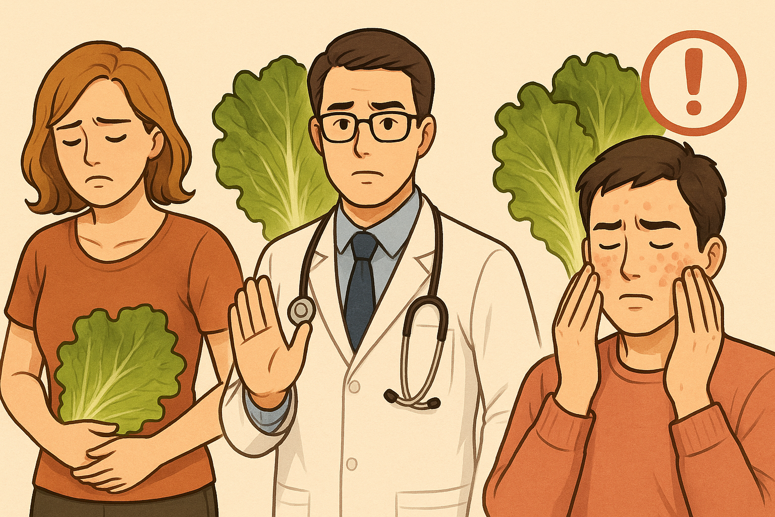일부 유럽 지역에서는 상추의 지질 전달 단백질(LTP) 때문에 심각한 알레르기 반응(아나필락시스)이 보고된 사례도 있어요 . - 교차 알레르기 가능성