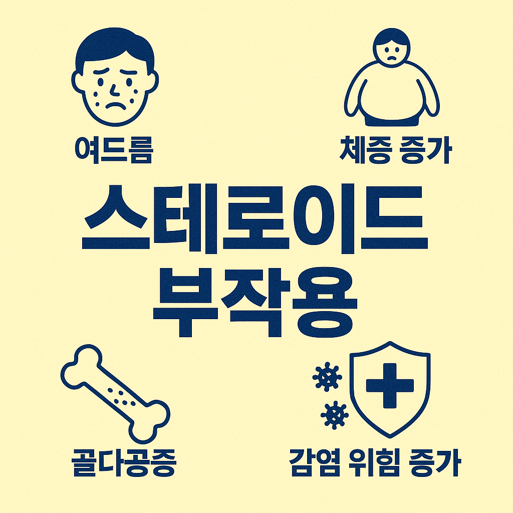 스테로이드는 몸에 염분을 붙잡아두는 성질이 있어서 붓기나 고혈압을 유발할 수 있거든요. 그래서 국물 줄이고, 짜게 먹는 습관은 싹 바꾸는 게 좋아요.