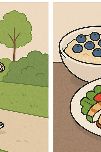 - 아침: 오트밀에 블루베리와 아몬드를 올려 먹어요. 오트밀은 식이섬유가 풍부하고, 블루베리는 항산화 성분이 많아 당독소 배출에 좋아요.