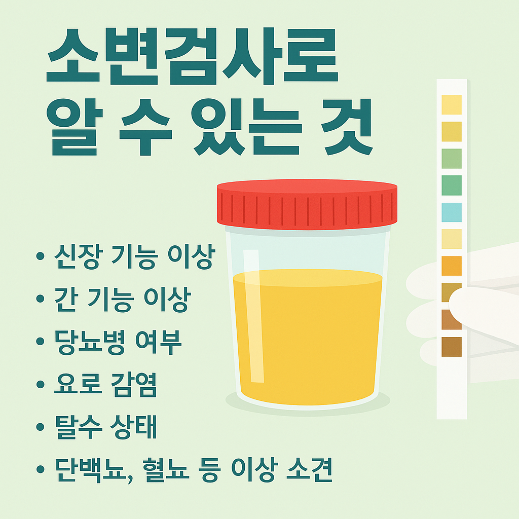 소변검사는 요로 감염, 신장(콩팥) 질환, 당뇨병, 간 질환, 그리고 대사 이상이나 전해질 불균형 같은 다양한 질환들을 미리 발견하는 데 도움이 된답니다 .
