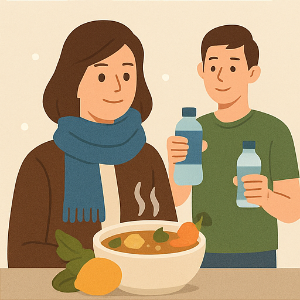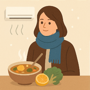 두꺼운 외투나 목도리 같은 보온 용품으로 체온을 잘 지키고, 따뜻한 국물요리나 제철 채소·과일을 골고루 섭취하면 면역력 유지에 도움이 돼요. 특히 단백질과 비타민C가 풍부한 귤, 해산물, 해조류가 겨울철엔 큰 역할을 해요 .
