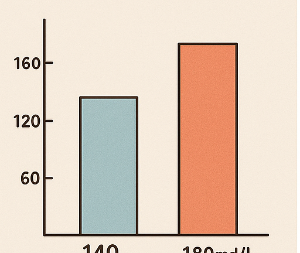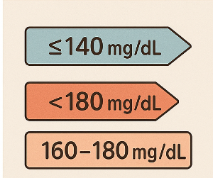 - 당뇨병 환자: 식후 2시간 혈당 < 180 mg/dL (일상목표), 또는 160–180 mg/dL 이하 (보다 현실적인 목표)