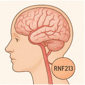 모야모야병은 원인이 확실히 밝혀지진 않았지만, 유전적 요인이 매우 강하게 관련 있는 질환이에요. 특히 RNF213 유전자의 R4810K 변이가 한국과 일본 환자들에서 매우 높게 나타난다는 연구가 있어요. 일반인보다 가족성 환자에선 훨씬 더 높죠 . 서양 환자에서는 다른 드문 변이들이 관련 있는 경우도 있다고 해요 .