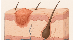 - 기저세포암(BCC)은 가장 흔한 형태로, 피부에 작은 돌기나 반투명한 융기 형태로 나타나며 전이는 거의 없이, 예후도 아주 좋아요 .