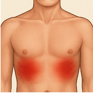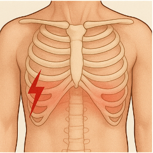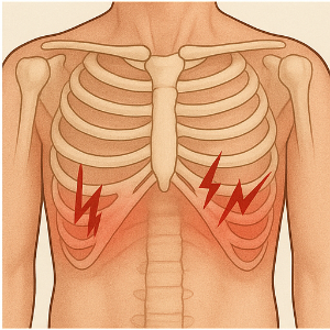 - Costochondritis (늑연골염): 갈비뼈와 흉골(가슴뼈)을 연결하는 연골에 염증이 생겨, 갈비뼈 앞쪽 아래에서 통증이 느껴지는 질환이에요. 움직이거나 누르면 아프며, 흉통으로 오인될 만큼 통증이 심할 수 있어요.
