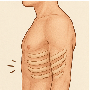 키네시오테이프를 활용하여 갈비뼈 주변의 근육을 부드럽게 잡아주면 움직일 때 통증 감소에 도움이 돼요 .