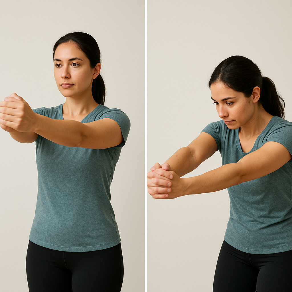- 깍지 낀 손을 앞으로 민 상태를 유지하면서, 어깨 뒷부분(어깨날개 주변 또는 견갑골 사이)에 당기는 감각을 느껴보세요.