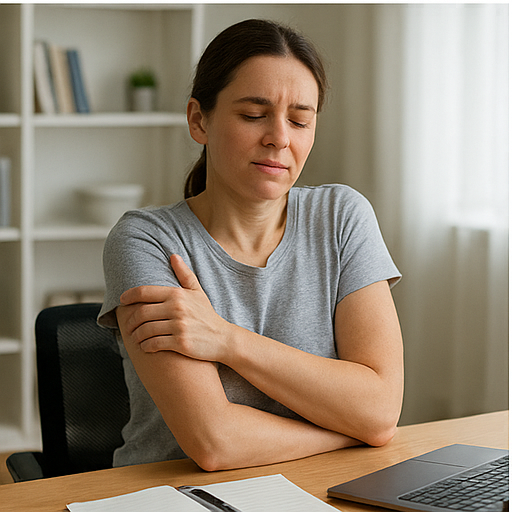 - 오랫동안 컴퓨터 앞에 앉아 있다 보면 어깨가 뻐근해지기 쉽죠. 이럴 때 자리에서 일어나지 않아도 간단한 어깨 스트레칭을 잠깐 해 주면 피로가 훨씬 줄어들어요.