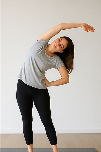 - 손을 머리 위로 든 상태를 유지하면서, 상체를 한쪽 방향으로 천천히 옆으로 기울여 보세요.