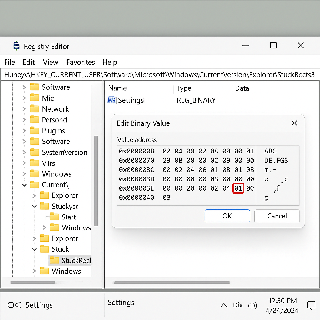 Settings 값의 특정 바이트를 01 또는 03으로 변경 → Explorer 재시작