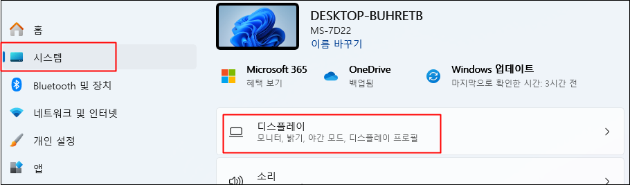 또는 윈도우 키 + I → 시스템 → 디스플레이