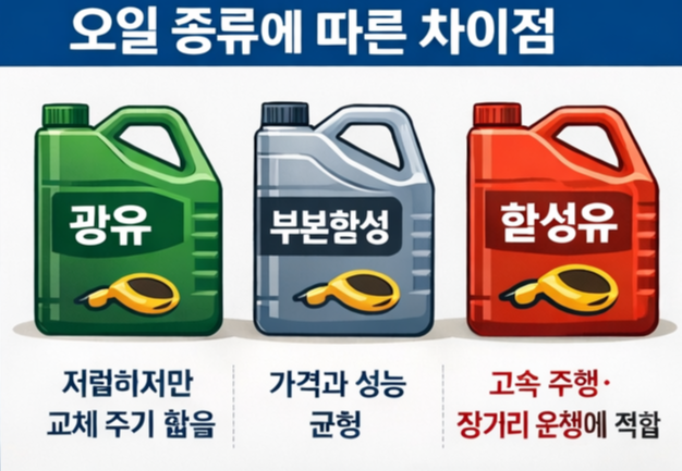 - 합성유: 고속 주행이나 장거리 운행이 잦은 경우 적합