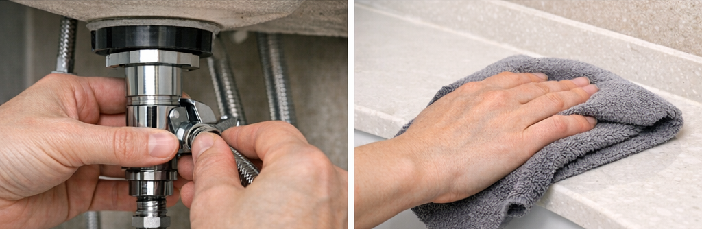 마지막으로 주변을 마른 수건으로 닦은 뒤, 약 10분 정도 후 다시 한 번 확인해 보시는 것이 좋습니다. 처음에는 문제가 없어 보여도 시간이 지나면서 미세 누수가 나타나는 경우가 있기 때문입니다.