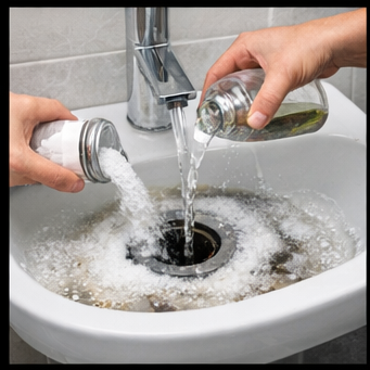 배수구에는 베이킹소다와 식초를 활용하면 효과적입니다. 베이킹소다를 넣은 뒤 식초를 부어 거품이 올라오도록 하고, 잠시 방치한 후 뜨거운 물로 헹궈주면 냄새의 원인이 되는 찌꺼기 제거에 도움이 됩니다.